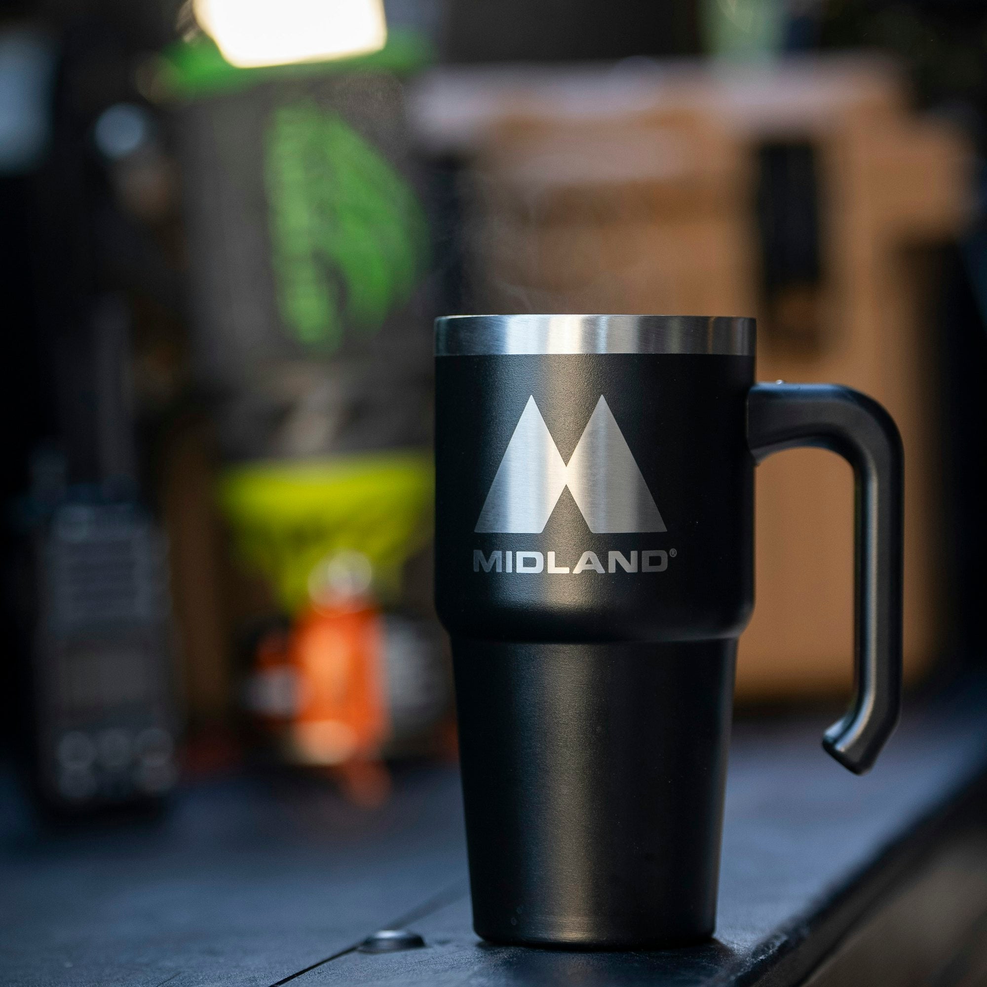 Kick back with a nice beverage- 20 oz. hot or cold Midland tumbler. This branded stainless steel tumbler comes with a lid and is double wall copper vacuum insulated. Keep your drinks hot for up to 12 hours and cold for up to 24 hours.