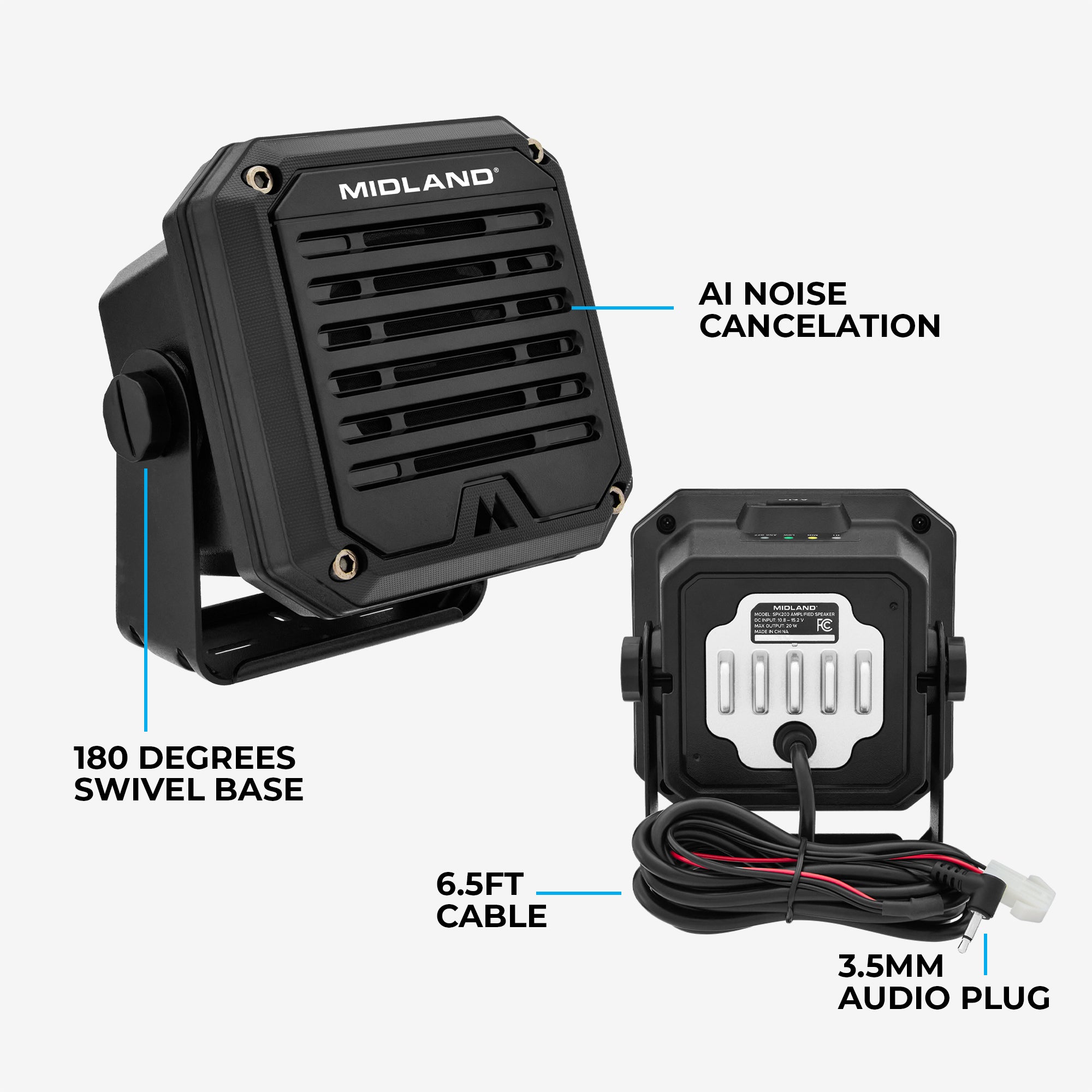 Bring seriously powerful communication to the farm with Midland’s 50-Watt Two-Way Farm Radio Bundle. This bundle brings maximum GMRS two-way radio power with Midland’s MXT500, 3 dB Ghost Antenna, antenna mount, and antenna cable, ensuring an installation that’s seamless, no matter which vehicle you put it in. Reach unrivaled sound quality with the SPK200’s 20 Watts of power and voice-learning AI chip that cancels out unwanted background noise to bring next-level communication to the toughest, loudest environments.