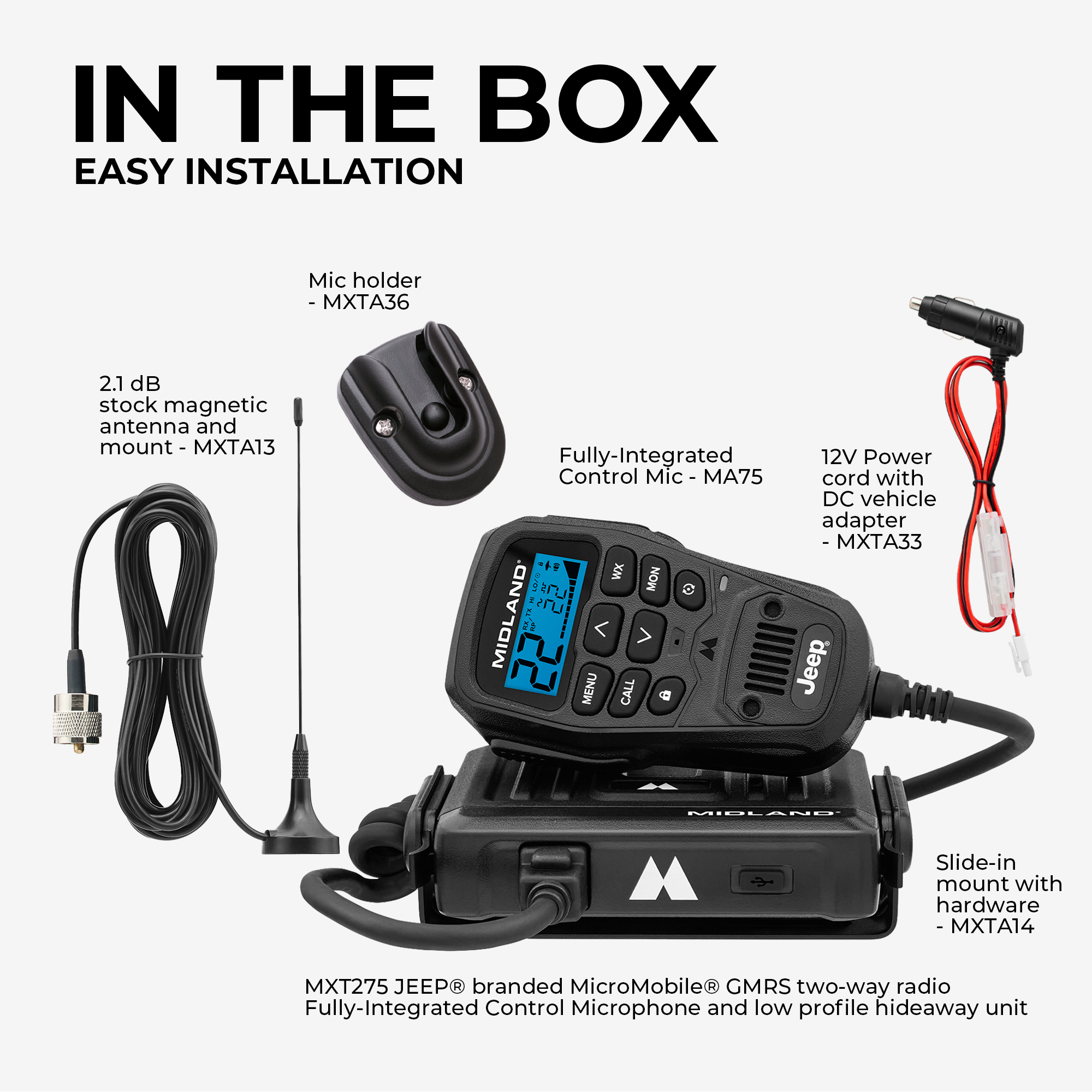 The ultimate plug-and-play GMRS base station for Jeep enthusiasts, the MXT275 features a Fully-Integrated Control Microphone  for increased dashboard space, clear communication, and life-saving emergency alerts.