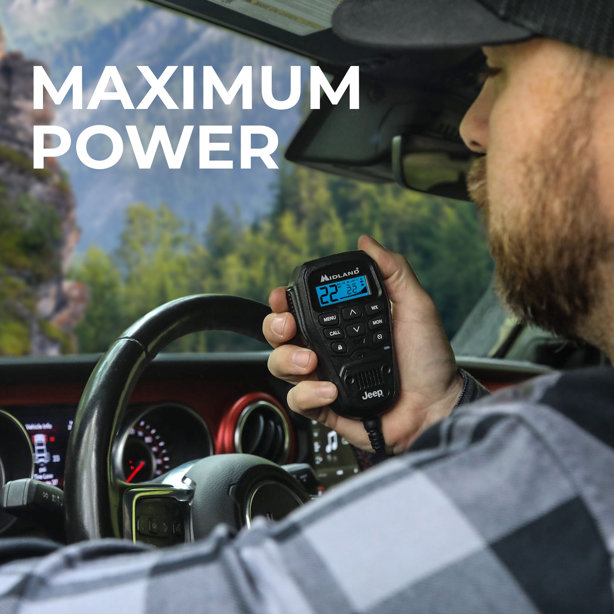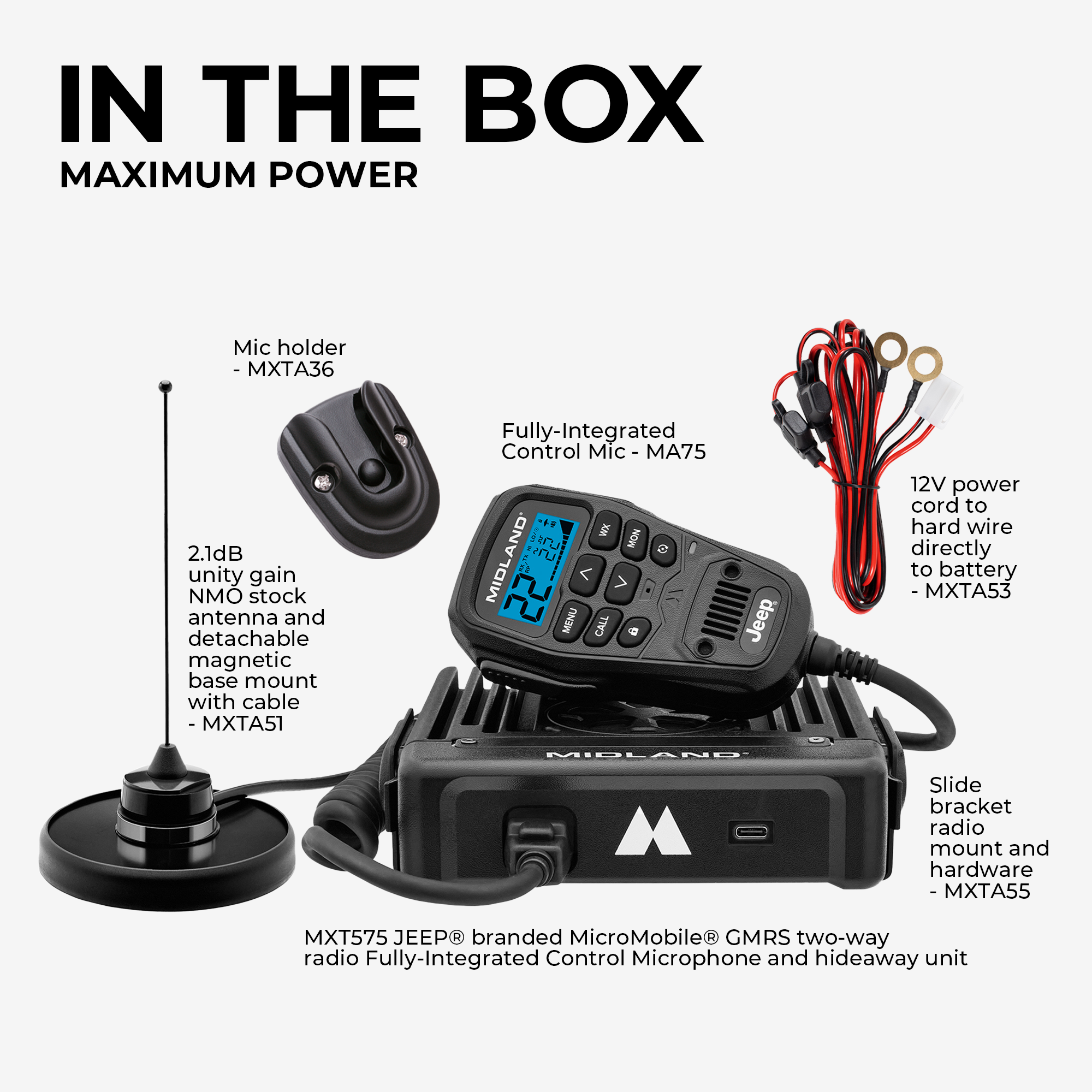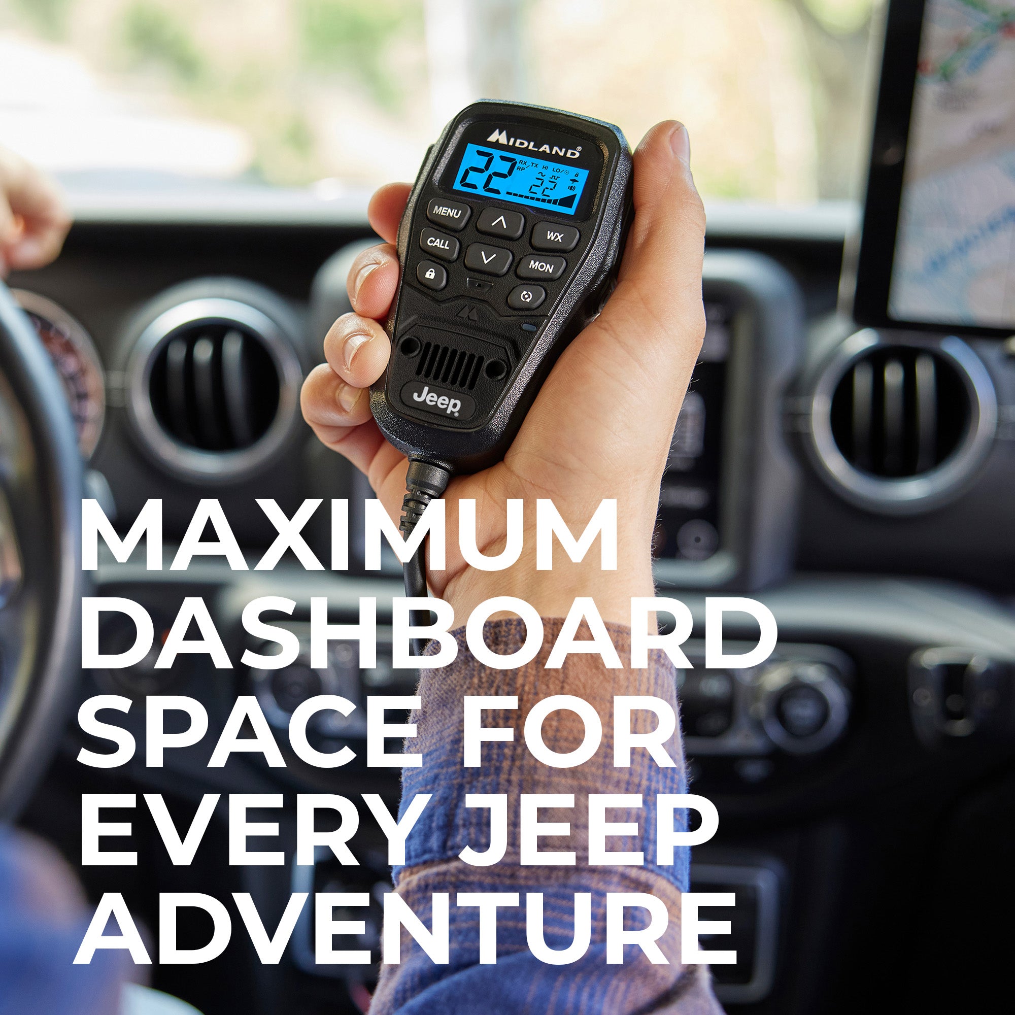 Midland’s MXT575 boasts the maximum GMRS power allowed by law- 50 Watts and a Jeep-branded Fully-Integrated Control Microphone that allows for hiding away, combining impressive range and a sleek design for in-vehicle communications.