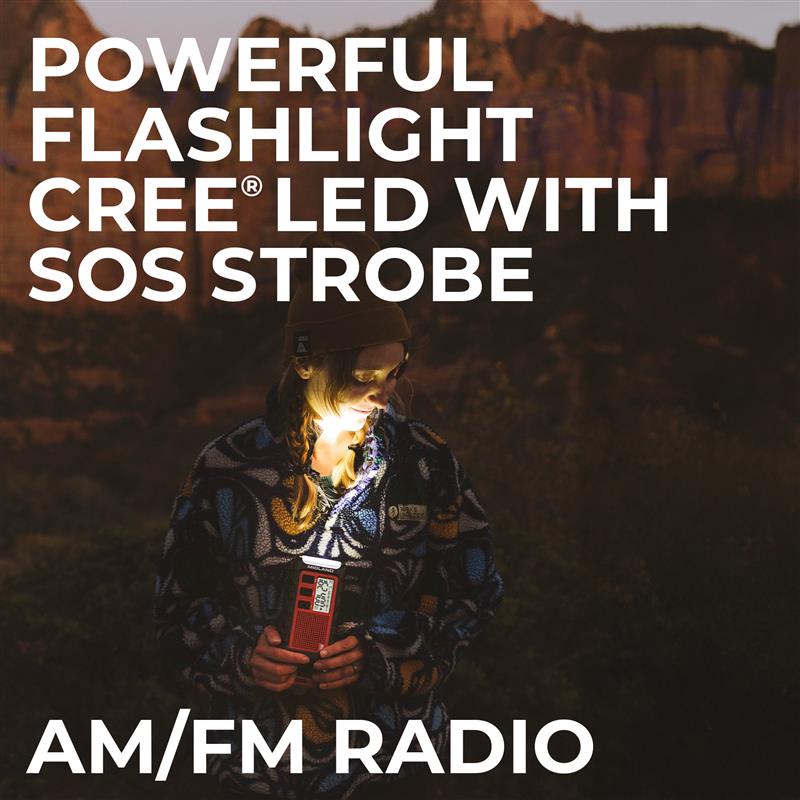 - Powerful Cree® LED Flashlight for power outages or navigating low-light areas with SOS Strobe to signal for help