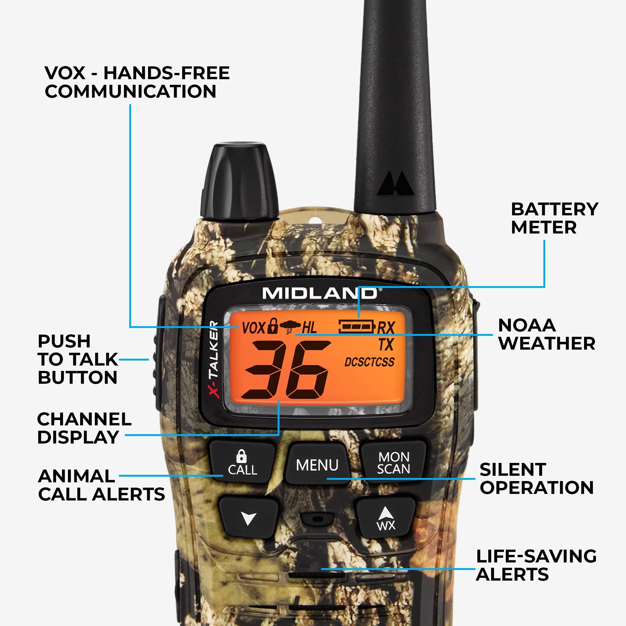 36 channels for clear, crisp communication with easy button access. Featuring 5 animal call sounds for use on the hunt, Midland’s T75 FRS handheld walkie talkies offer users clear transmission and sound quality in a Mossy Oak Break-Up Country pattern, making them an essential for any adventure.
