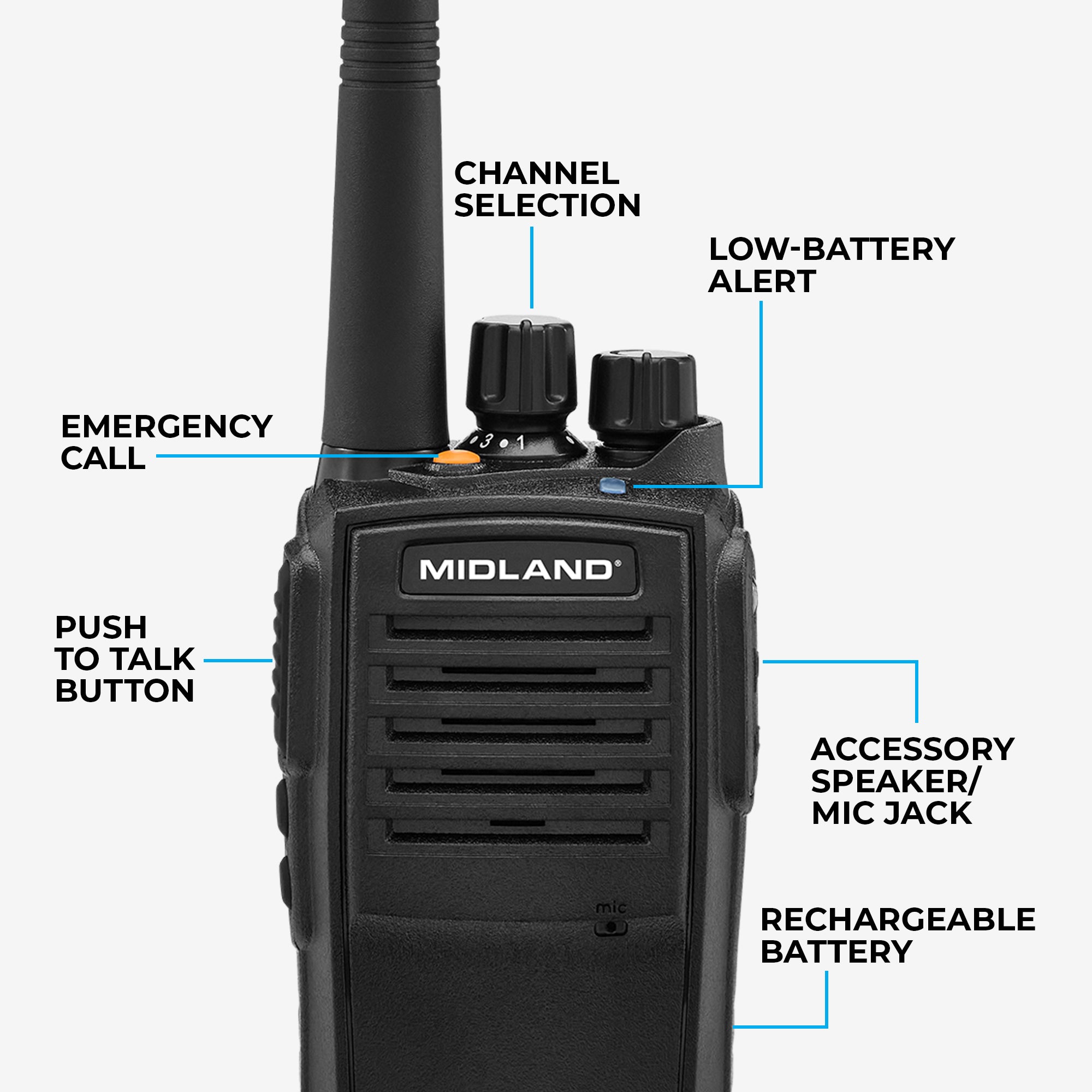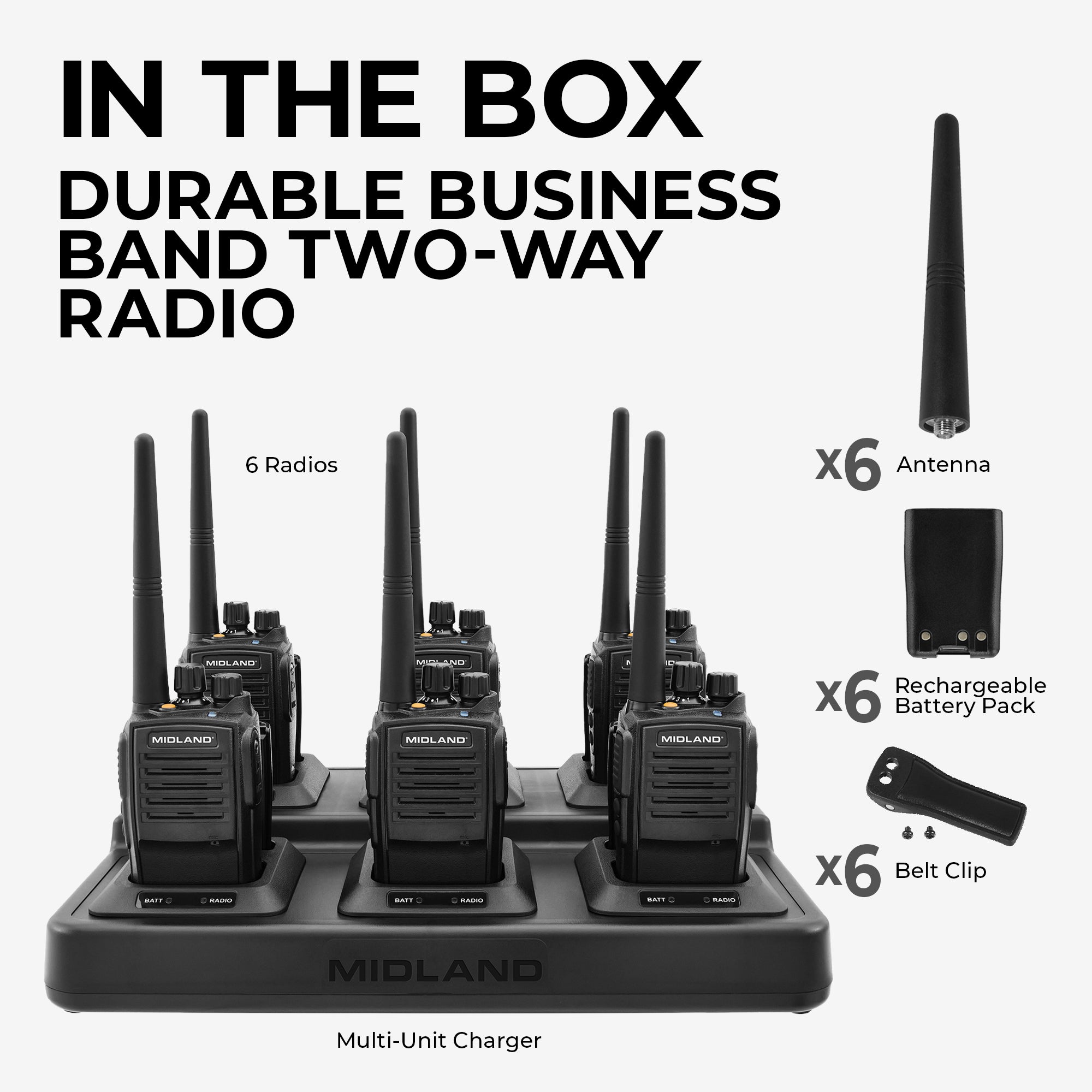 Midland’s MB400 boosts powerful communication with 4 Watts of power and a heavy-duty design that performs in the toughest of environments, improving efficiency for any business. This bundle includes 6 business radios and a multi-unit charger that will replenish the battery life before the next shift.