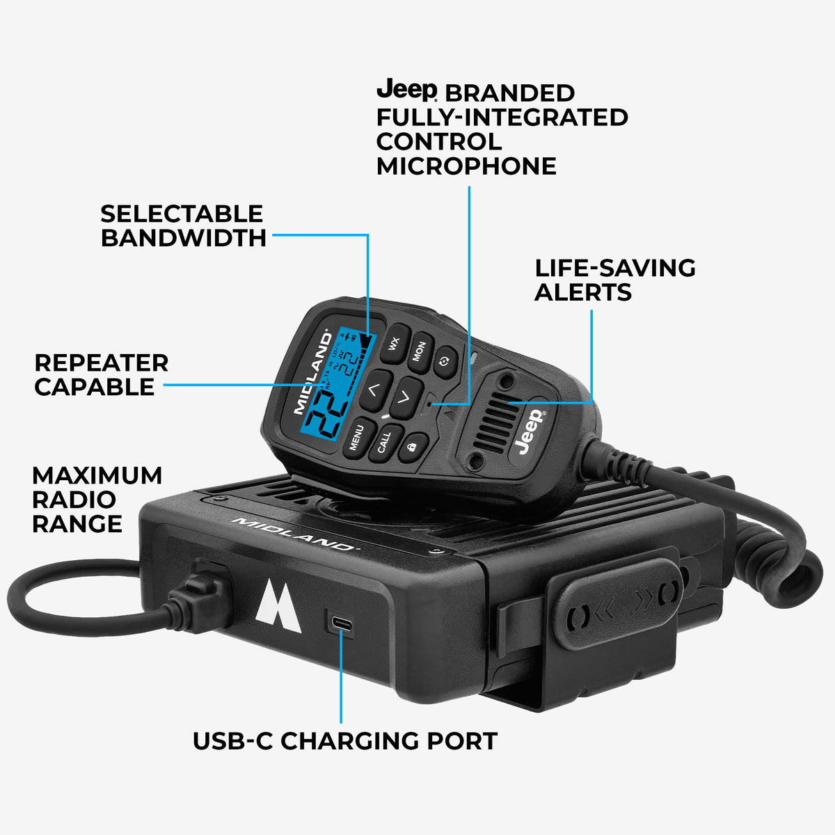 Midland’s MXT575 boasts the maximum GMRS power allowed by law- 50 Watts and a Jeep-branded Fully-Integrated Control Microphone that allows for hiding away, combining impressive range and a sleek design for in-vehicle communications.