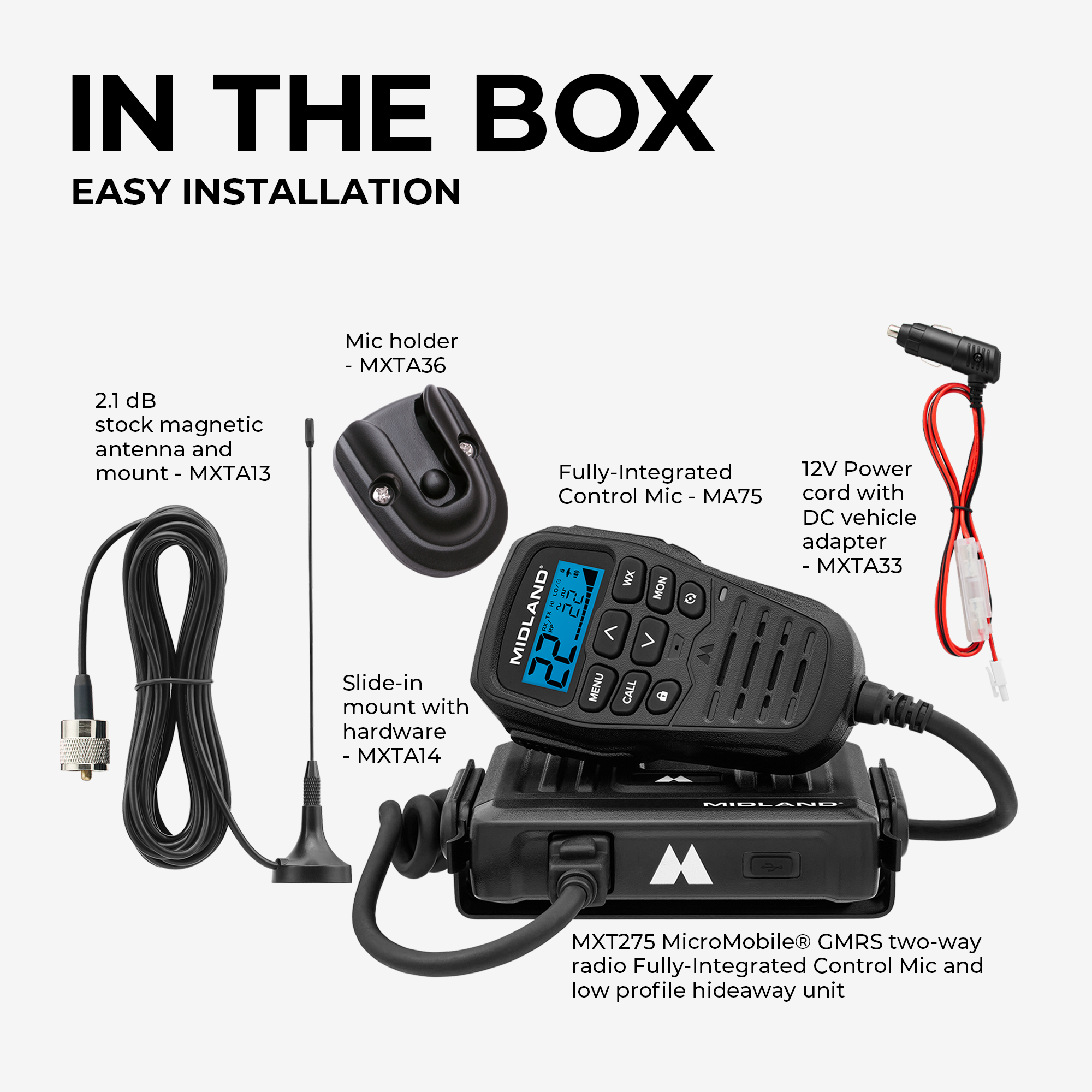 • MXT275 MicroMobile® GMRS two-way radio Fully-Integrated Control Mic and low profile hideaway unit